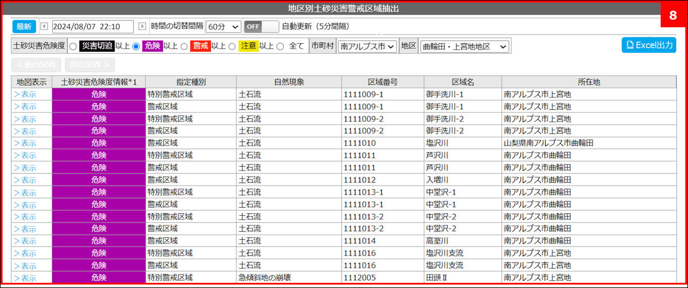 - 地区別土砂災害警戒区域抽出画面が表示されます。